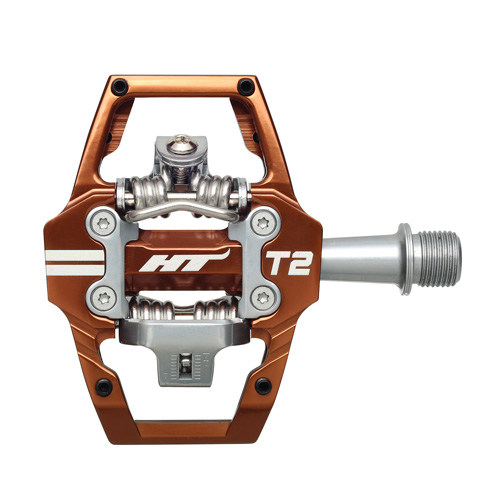 T2 Clipless Pedals are HT’s elite level Enduro pedal. These pedals have been tested and won multiple World Championships, in every condition imaginable and are arguably one of the best clipless Enduro pedal options available. They weigh in at a remarkable 376 g per pair. Are made from extruded CNC optimized aluminum for ultimate strength to weight ratio. They have world-class mud, snow and ice clearing. They are very easy to engage and disengage. They also offer the most adjustable dual tension clip-in mechanism on the market. The adjustable clip tension allows riders to fine-tune their pedals dependent upon course/trail conditions. Available in multiple colors!